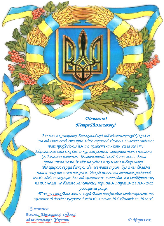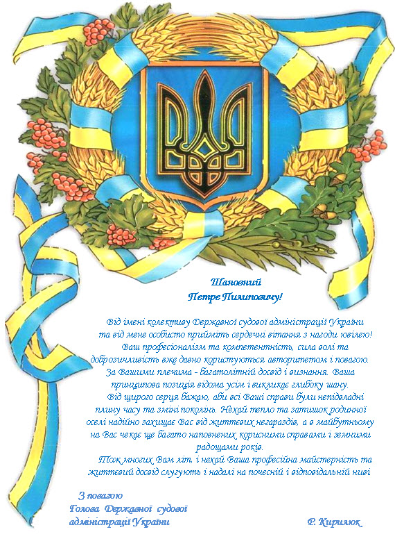 Привітання Голови Державної судової адміністрації України Голові Верховного Суду України з ювілеєм