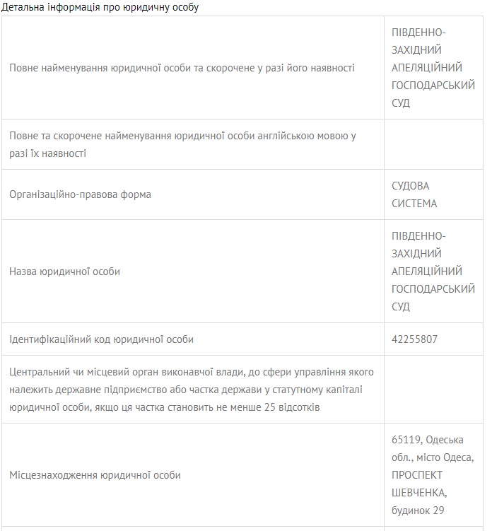 20 червня 2018 року, Південно-західний апеляційний господарський суд було зареєстровано як юридичну особу. Ідентифікаційний код юридичної особи – 42255807 в Єдиному державному реєстрі юридичних осіб, фізичних осіб - підприємців та громадських формувань.