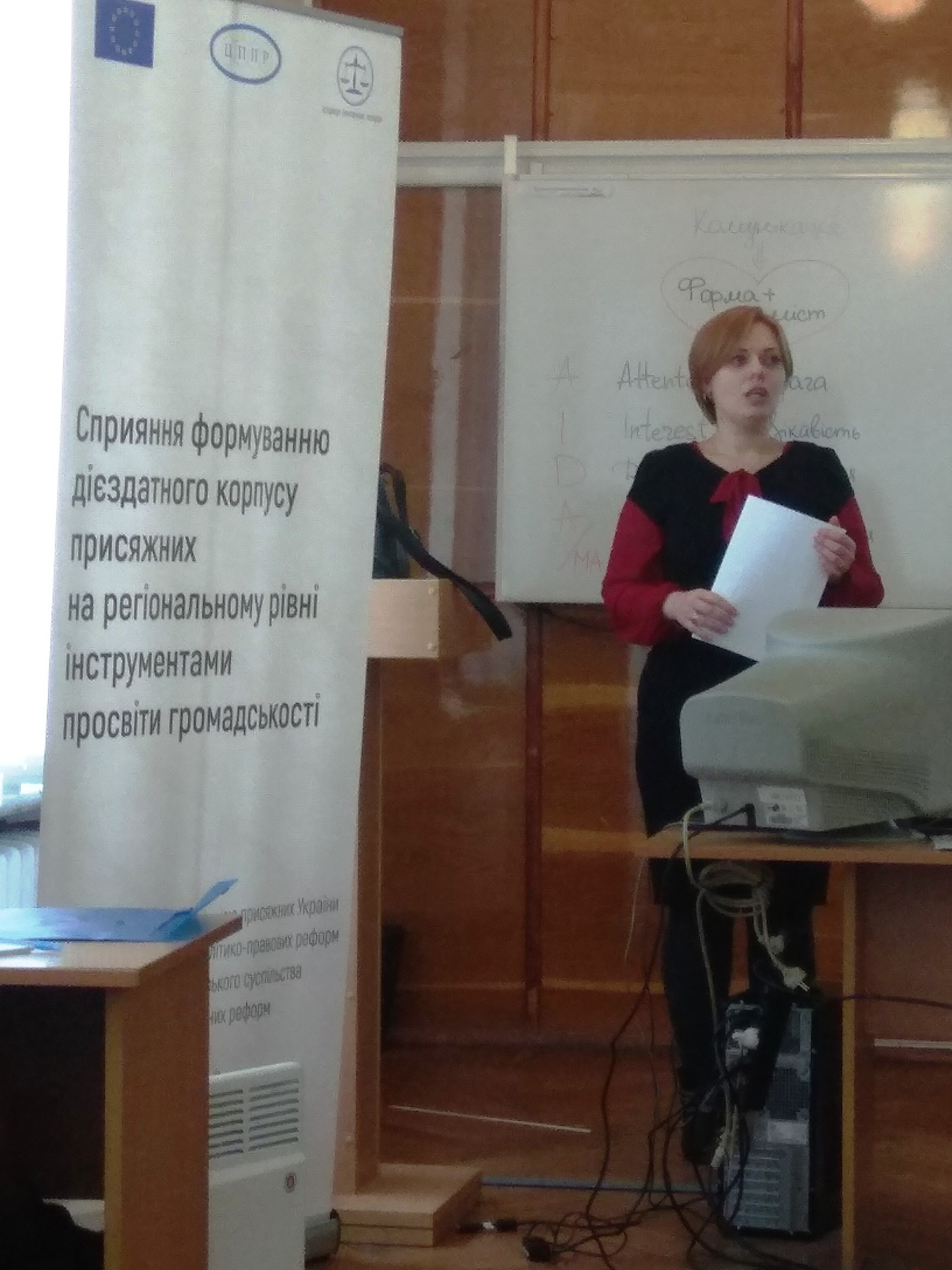 Разом з тим, координатором Громадської мережі публічного права та адміністрації UPLAN, експертом з комунікацій Ксенією Дітчук було роз’яснено присутнім план та цілі інформаційно - роз’яснювальної кампанії про можливості громадян України брати безпосереднью участь у здійсненні правосуддя, визначено цільові аудиторії інформаційно – роз`яснювальної кампанії. Також шляхом проведення практичних занять було досліджено засади формулювання ключових повідомлень для цільових аудиторій, обговорено канали та інструменти комунікації з питань інституту присяжних в діяльності місцевих (окружних) судів.