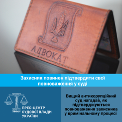 Адвокати, які здійснюють захист підозрюваних, обвинувачених або інших осіб, зазначених у статті 45 Кримінального процесуального кодексу України у Вищому антикорупційному суді, повинні належним чином підтвердити свої повноваження. Повноваження захисників у кримінальному провадженні мають бути підтверджені саме перед Вищим антикорупційним судом.