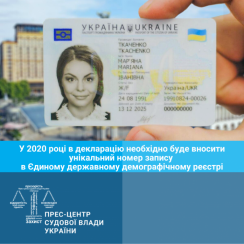 З 1 січня 2020 року суб’єктам декларування при заповненні декларації необхідно буде зазначити відомості про свій унікальний номер запису в Єдиному державному демографічному реєстрі (УНЗР) та вказати відповідні номери членів сім’ї. Такі зміни до статті 46 Закону України «Про запобігання корупції» набули чинності 18 жовтня 2019 року (Закон № 140-IX).