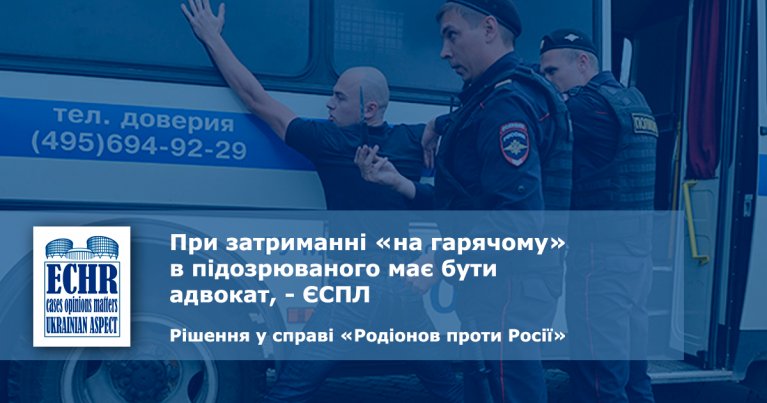 Тоді він звернувся за захистом в ЄСПЛ. У Страсбурзі, зокрема, звернули увагу на те, що під час затримання заявника та складанні протоколу огляду його машини він не був належним чином поінформований про право на юридичну допомогу та про право не свідчити проти самого себе. Про права Родіонов дізнався через 18 годин після затримання. У зв’язку з цим ЄСПЛ зазначив, що право заявника на юридичну допомогу було обмежено, а обвинувачення у кримінальній справі базувалося переважно на протоколі огляду транспортного засобу, при складанні якого були порушені права заявника. Сукупність зазначених фактів привела до порушення ст.ст. 3, 6 Конвенції про захист прав людини і основоположних свобод.