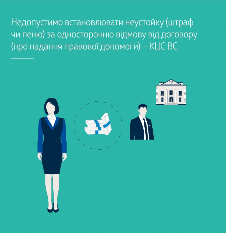 Суд першої інстанції, з рішенням якого погодився апеляційний суд, визнав повністю недійсним пункт договору про надання правової допомоги, у якому зокрема, передбачалося, що в разі односторонньої відмови клієнтки від договору вона повинна сплатити адвокату додаткову винагороду в розмірі 30 % від вартості отриманого нею майна чи коштів, але не менше суми, еквівалентної 10 тис. доларів США.