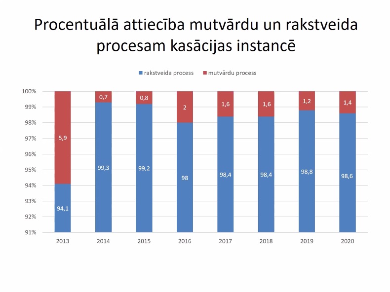Зазначалося, що судді Департаменту адміністративних справ ВС Латвії дуже часто працюють віддалено, у цій інстанції справи розглядаються переважно в письмовому провадженні, з 2014 року кількість усних проваджень становить 1–2 % (див. слайд). Учасник справи може висловити бажання розгляду справи в усному провадженні, тоді суд повинен обґрунтувати, чому він не вважає за потрібне слухати справу в такому форматі.
