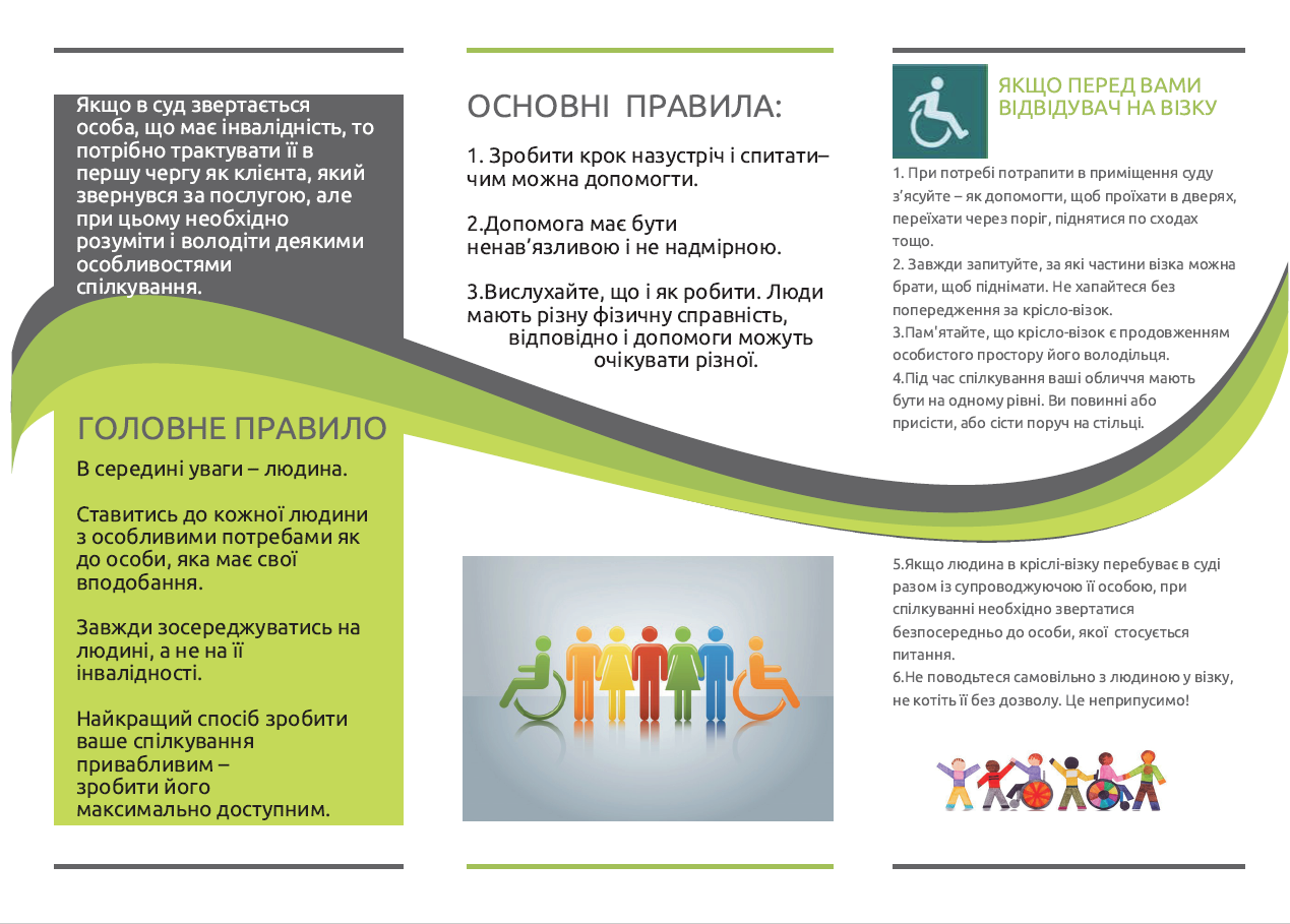 Якщо в суд звертається особа, що має інвалідність, то потрібно трактувати її в першу чергу як клієнта, який звернувся за послугою, але при цьому необхідно розуміти і володіти деякими особливостями у спілкуванні.