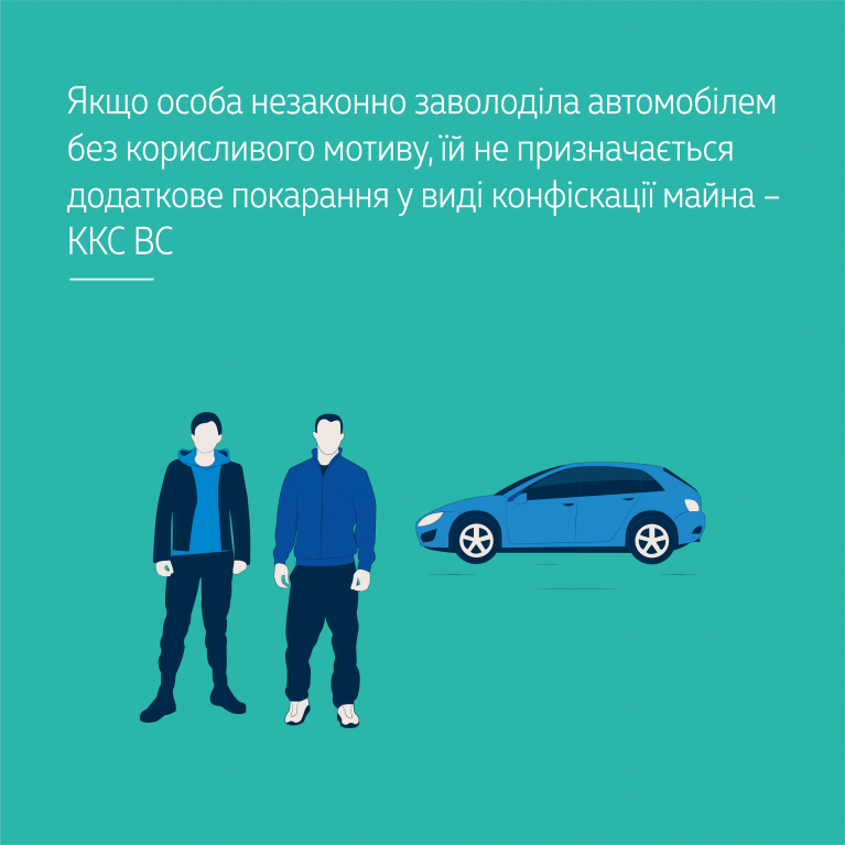 Касаційний кримінальний суд у складі Верховного Суду виключив із судових рішень призначене одному із засуджених додаткове покарання за незаконне заволодіння автомобілем (ч. 2 ст. 289 КК України) у виді конфіскації всього майна, що є його власністю, оскільки в його злочинних діях не було встановлено корисливого мотиву.