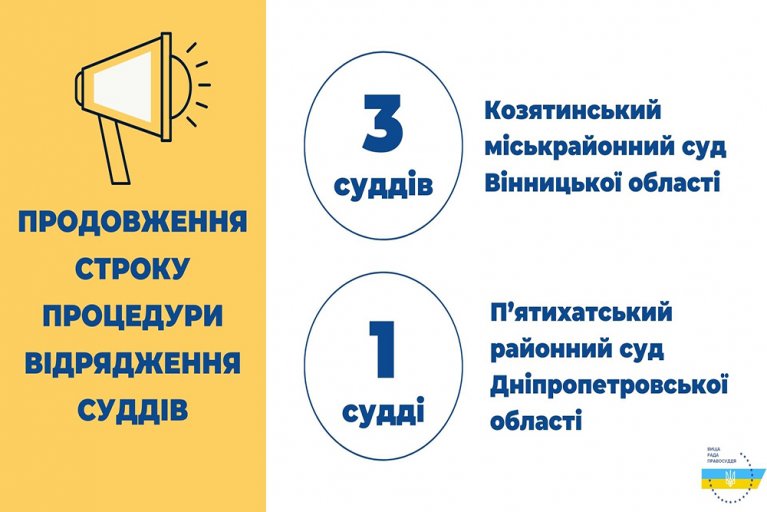 Вища рада правосуддя відповідно до рішень від 4 березня 2021 року № 582/0/15-21 та № 583/0/15-21 продовжила строк надання суддями згоди на відрядження до Козятинського міськрайонного суду Вінницької області та П’ятихатського районного суду Дніпропетровської області до 15 березня 2021 року.