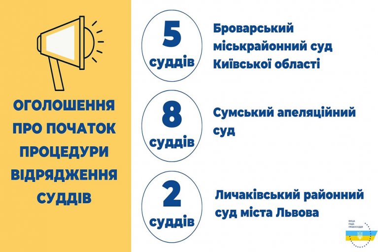 Вища рада правосуддя відповідно до рішень від 11 березня 2021 року №№ 625/0/15-21, № 626/0/15-21, 629/0/15-21, оголошує про початок процедури відрядження суддів до іншого суду того самого рівня і спеціалізації для здійснення правосуддя, а саме до: