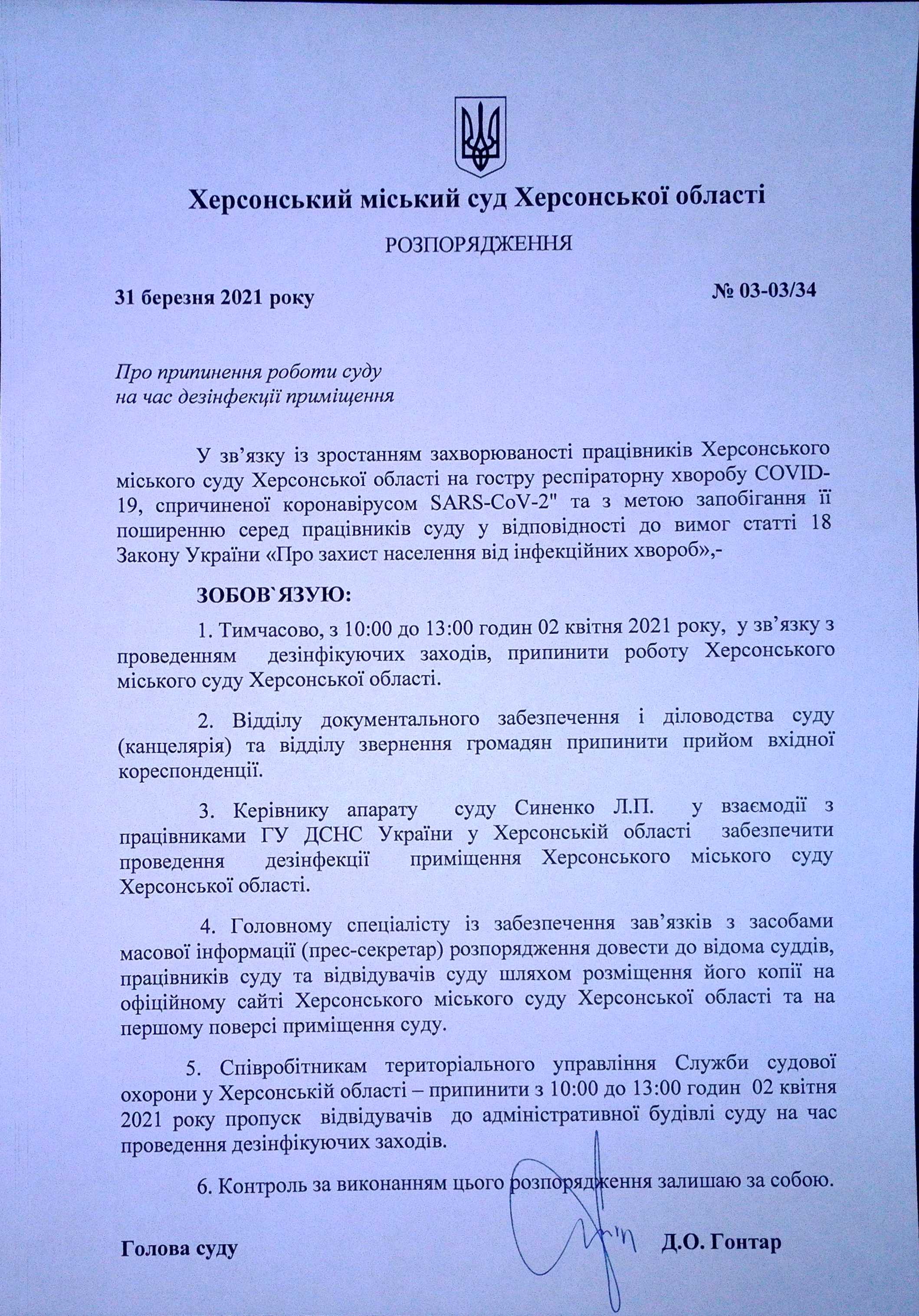 З метою попередження розповсюдження інфекційних захворювань та у зв'язку з лабораторно підтвердженими випадками захворювання на гостру респіраторну хворобу COVID-19 серед працівників апарату суду, 2 квітня з 10:00 до 13:00 год. у приміщенні суду буде проведена дезінфекція.