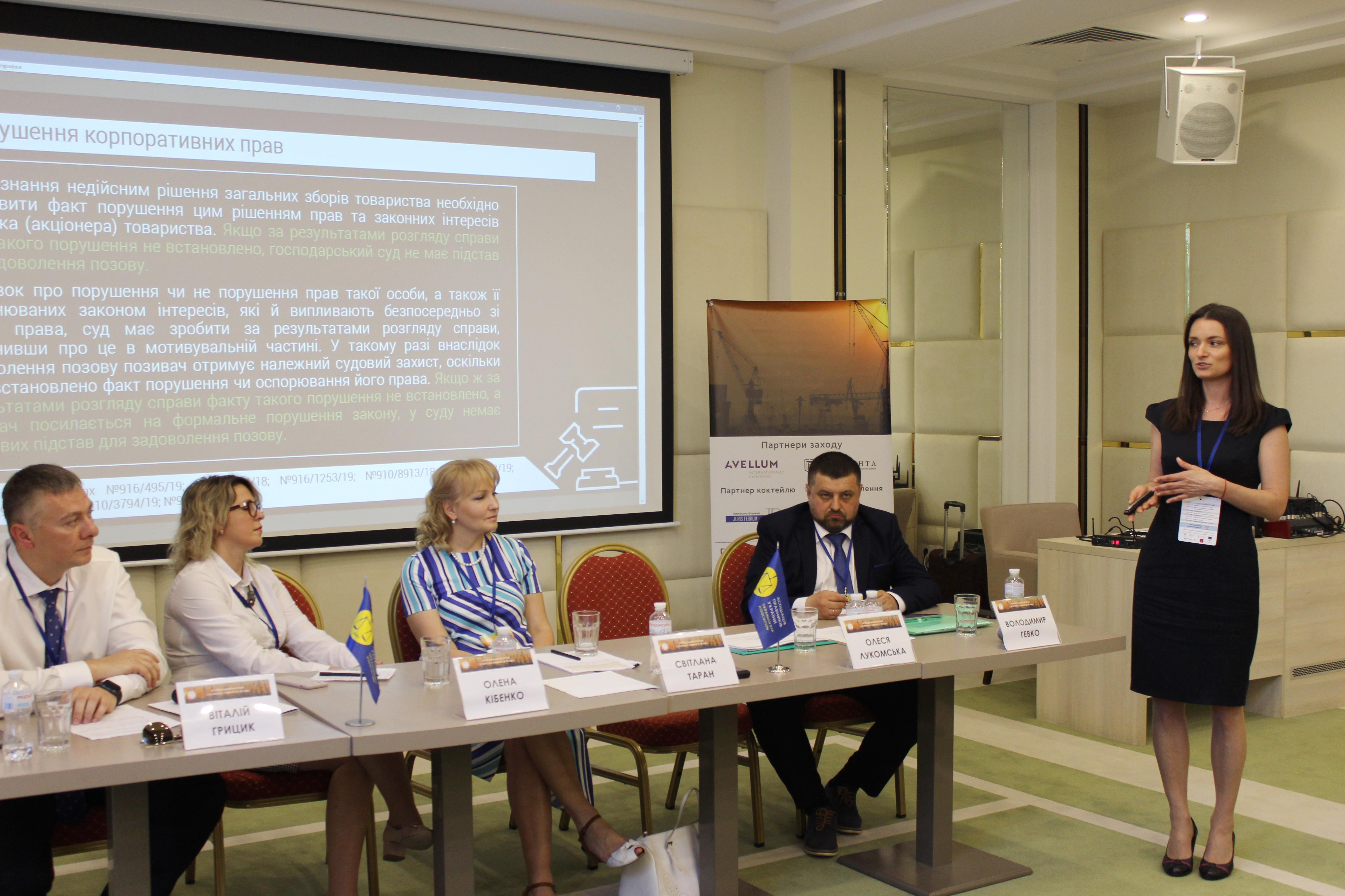 Начальник відділу забезпечення роботи секретаря та суддів судової палати управління забезпечення роботи судової палати для розгляду справ щодо корпоративних спорів, корпоративних прав та цінних паперів секретаріату КГС ВС Олеся Лукомська розпочала свій виступ із характеристики корпоративних спорів крізь призму статистичних даних щодо розгляду цієї категорії спорів ВС. Зокрема, вона зазначила, що, незважаючи на порівняно невелику загальну кількість корпоративних спорів серед інших господарських спорів, саме в цій категорії утримується високий відсоток оскарження. Так, до касаційної інстанції оскаржується понад 50 % судових рішень цієї категорії. Найбільшу кількість вимог у корпоративних спорах становлять вимоги про визнання недійсними рішень органів юридичних осіб – це понад 40 % від усіх вимог у корпоративних спорах.