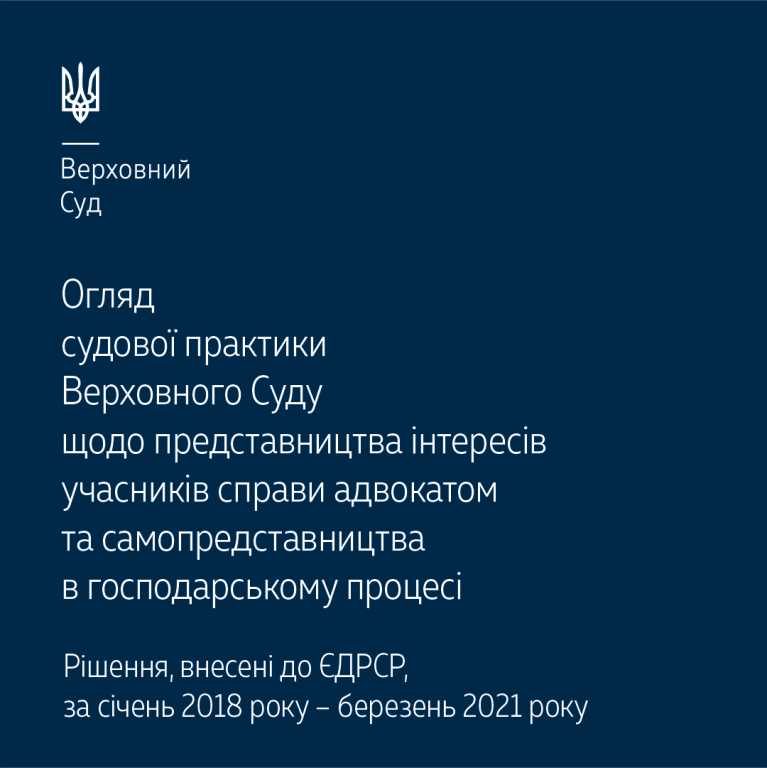 Пропонуємо до вашої уваги огляд судової практики Верховного Суду щодо представництва інтересів учасників справи адвокатом та самопредставництва в господарському процесі (за період із січня 2018 року по березень 2021 року), підготовлений судовою палатою для розгляду справ щодо земельних відносин та права власності Касаційного господарського суду у складі Верховного Суду спільно з правовим управлінням (ІІ) департаменту аналітичної та правової роботи.