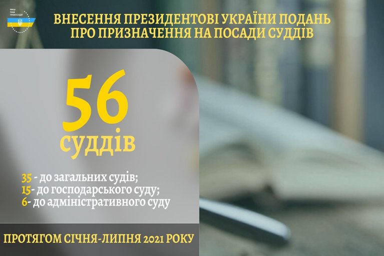Протягом перших семи місяців 2021 року Вища рада правосуддя прийняла рішення про внесення Президентові України подання про призначення на посади 56 суддів до місцевих судів:
