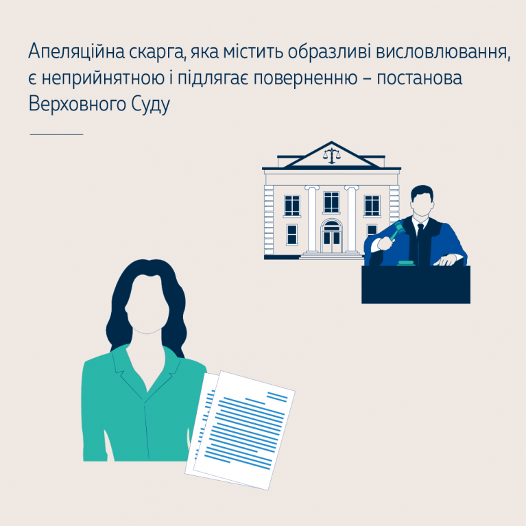 ВС погодився з висновками суду апеляційної інстанції, що зазначені в апеляційній скарзі висловлювання на адресу прокурорів, суддів та суду є образливими, а апеляційна скарга, що містить такі висловлювання, є неприйнятною. Учасники справи зобов’язані виявляти повагу до суду та до інших учасників судового процесу. Заяви та скарги, що подаються до суду, мають відповідати вимогам чинного законодавства. У тексті цих документів не можна використовувати образливі та лайливі слова, символи, зокрема для надання особистих характеристик учасникам справи, іншим учасникам судового процесу, їх представникам і суду. У протилежному випадку це свідчить про очевидну неповагу до честі, гідності цих осіб з боку автора документа. Такі дії суперечать основним засадам і завданням судочинства та можуть бути визнані судом як зловживання процесуальними правами.