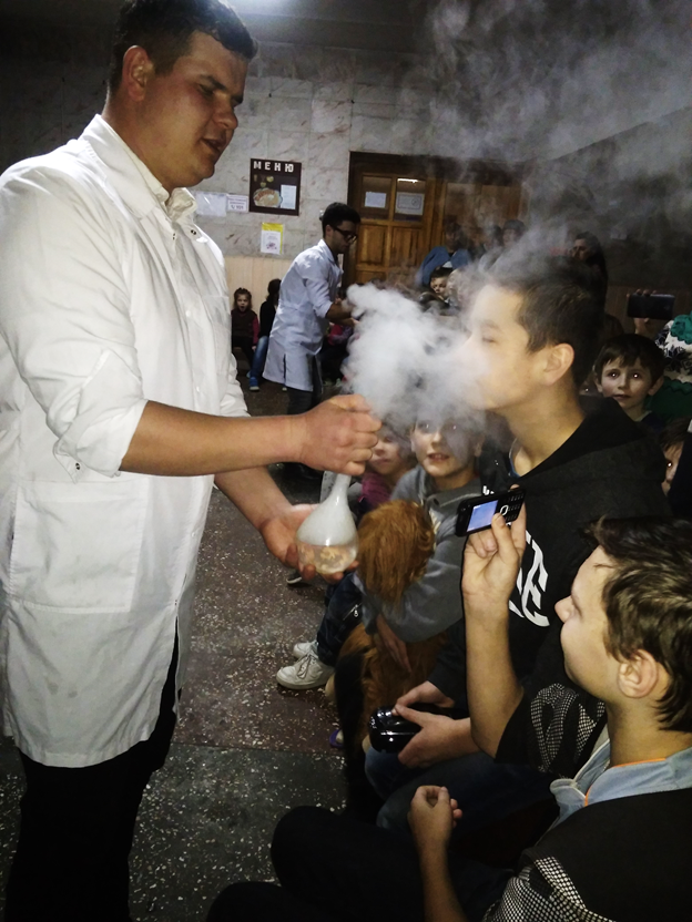 Проте великою несподіванкою для них стало шоу Великих Хіміків Аргона та Радона, які розповідали різні історії з життя Великої Країни Хімії. Дітлахи із захопленням слухали цікавинки про різні хімічні реакції, дізнавалися звідки береться газ, що таке дирижабль, чи пече рідкий азот, скільки важить кулька, складали та розв’язували арифметичні задачі, спостерігали за хімічними дослідами Великих Хіміків.