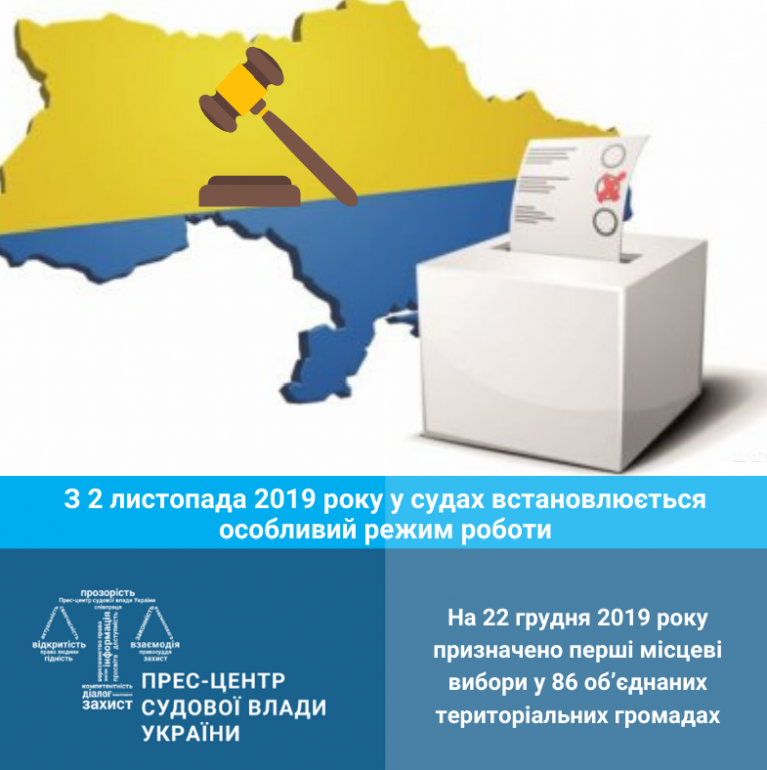 У зв’язку з цим на період виборчого процесу у судах починаючи з 2 листопада 2019 року з метою організаційного забезпечення оперативного прийняття позовних заяв (документів), підготовки та розгляду адміністративних справ відповідної категорії встановлено особливий режим роботи для суддів та працівників апаратів судів.