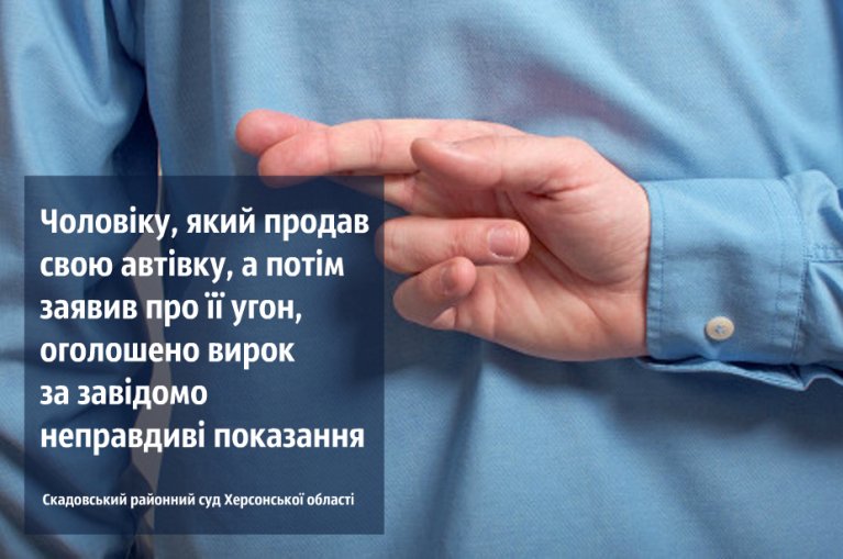 Органами досудового слідства мешканець Скадовського району обвинувачувався у тому, що 16.09.2019 з метою притягнення невинної особи до кримінальної відповідальності, завідомо неправдиво повідомив слідчого Скадовського ВП Новокаховського ВП ГУНП в Херсонській області про те, що 08.09.2019 малознайомі особи, перебуваючи за місцем його проживання незаконно заволоділи його автомобілем марки «ВАЗ 2107» червоного кольору, який насправді він продав. Під час допиту у якості потерпілого, чоловік повторив свої неправдиві показання щодо незаконного заволодіння його автомобілем.