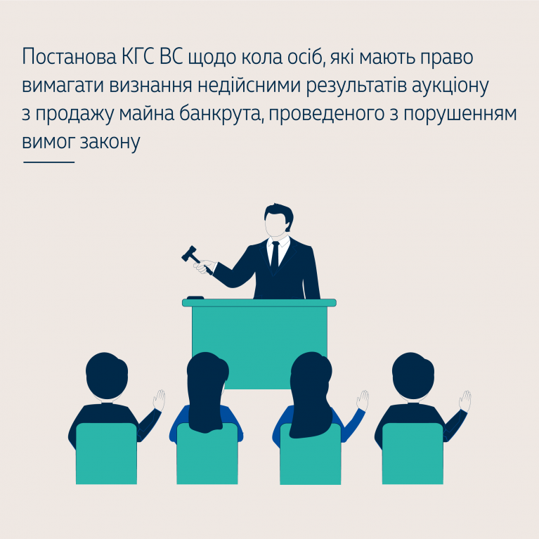 Отже, вимагати визнання недійсним результатів аукціону, проведеного з порушенням вимог закону, можуть боржник (зокрема арбітражний керуючий від імені боржника), кредитори, зареєстровані учасники аукціону, особи, які вважають себе власниками майна, що виставляється на аукціон.