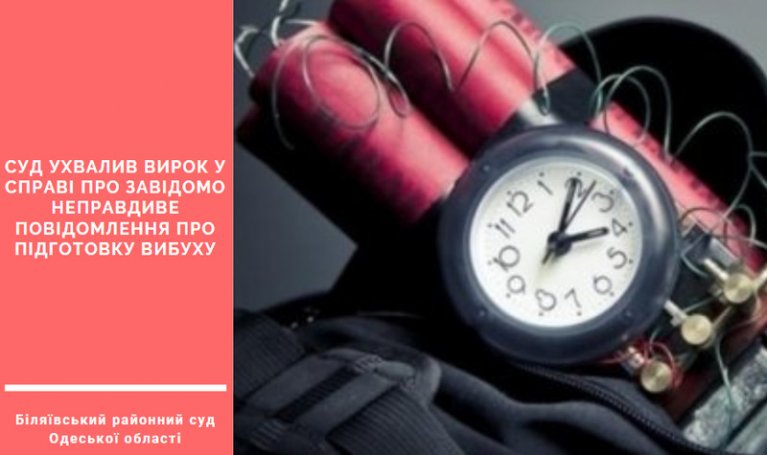 6 грудня 2019 року Біляївський районний суд Одеської області визнав винним громадянин В. у скоєнні злочину, передбаченого частиною першою статті 259 Кримінального кодексу України (завідомо неправдиве повідомлення про підготовку вибуху, які загрожують загибеллю людей чи іншими тяжкими наслідками) і призначив йому покарання у виді 2 років позбавлення волі.