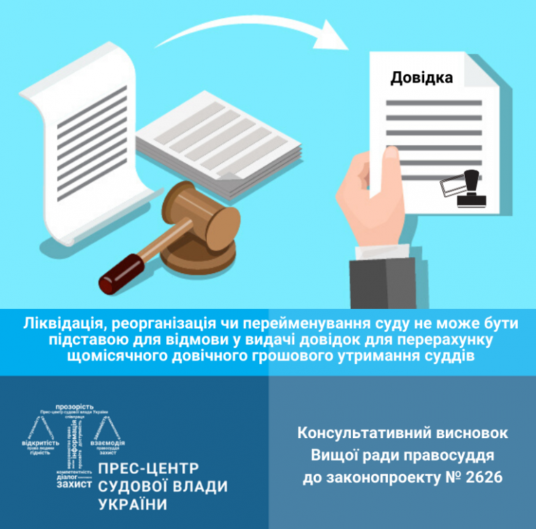 Ліквідація, реорганізація чи перейменування суду, в якому раніше працював суддя у відставці, на думку Вищої ради правосуддя, не може бути підставою для відмови у видачі іншим судом або органом державної влади довідок для перерахунку щомісячного довічного грошового утримання, необхідних суддям у відставці.