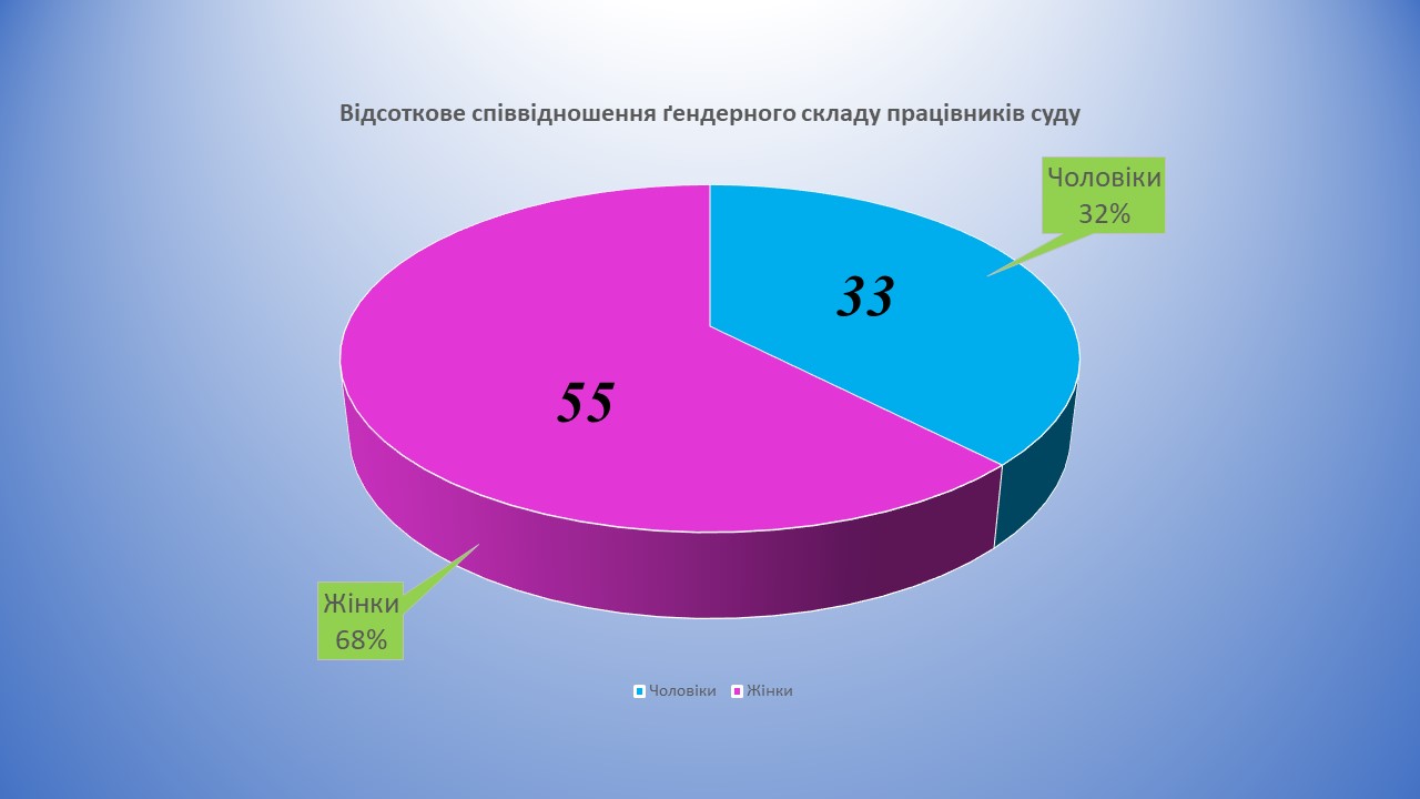 Станом на 01.01.2020 в суді працює 88 осіб, переважну більшість складають жінки – 68 відсотки. Більш детальну інформація відображено в таблиці.