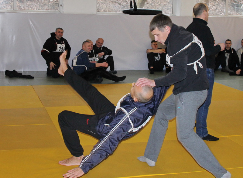 У перерві між іспитами перед учасниками виступив президент Всеукраїнської федерації рукопашного бою Олександр Гартвич, який не тільки продемонстрував деякі з прийомів, а й пояснив техніку затримання залежно від пори року.