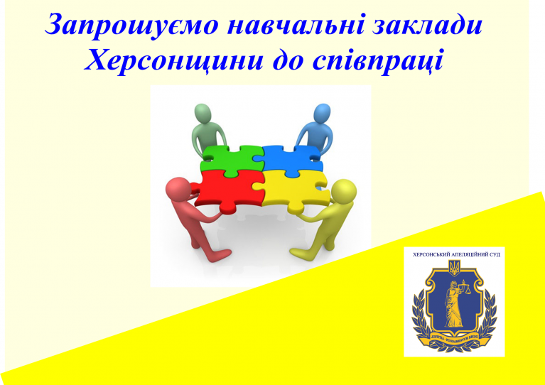 Для досягнення вказаних цілей запрошуємо навчальні заклади Херсонщини до спільної організації та проведення навчально-виховних заходів різноманітних форматів (лекцій, уроків, днів відкритих дверей, моделювання розгляду судової справи тощо) під час яких працівники суду, судді розкажуть школярам та студентам про функції та завдання органів судової влади, свої професійні обов’язки, судовий процес тощо, а юні гості спробують себе у ролі сторони справи, судді та ін.
