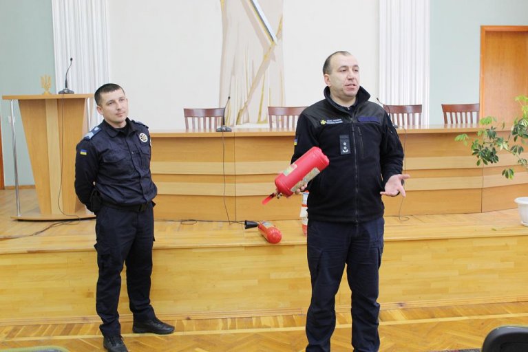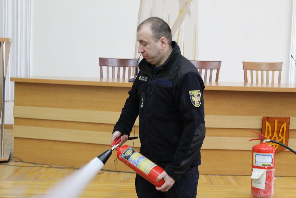 “Універсальним є порошковий вогнегасник, яким можна гасити вогонь навіть на комп'ютері чи електроприладах, але спочатку прилади потрібно вимкнути з розетки. Щоправда, для гасіння електроприладів ефективніше використовувати вуглекислотні, при горінні паливно-мастильних матеріалів — водопінні, а щоб погасити локальну пожежу, наприклад, у кімнаті, найкраще скористатись аерозольним вогнегасником”, — наголосив викладач — методист.