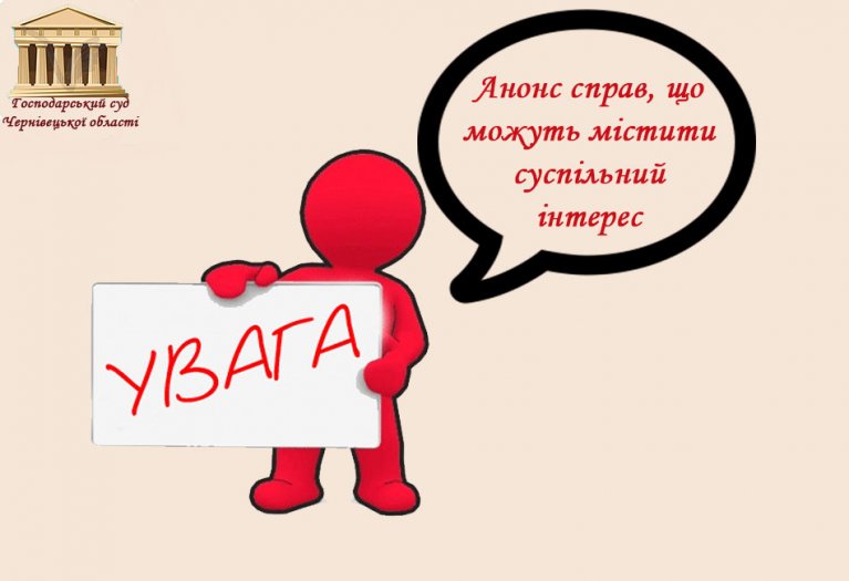 18 березня 2020 року об 11:00 в залі судових засідань №3 (другий поверх) Господарського суду Чернівецької області (м. Чернівці, вул. Кобилянської, 14) відбудеться розгляд справи 926/31/20, провадження в якій порушено