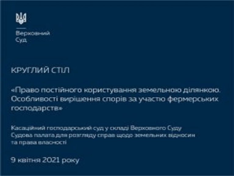 9 квітня 2021 року о 10:00 розпочнеться круглий стіл на тему «Право постійного користування земельною ділянкою. Особливості вирішення спорів за участю фермерських господарств», організований Верховним Судом.