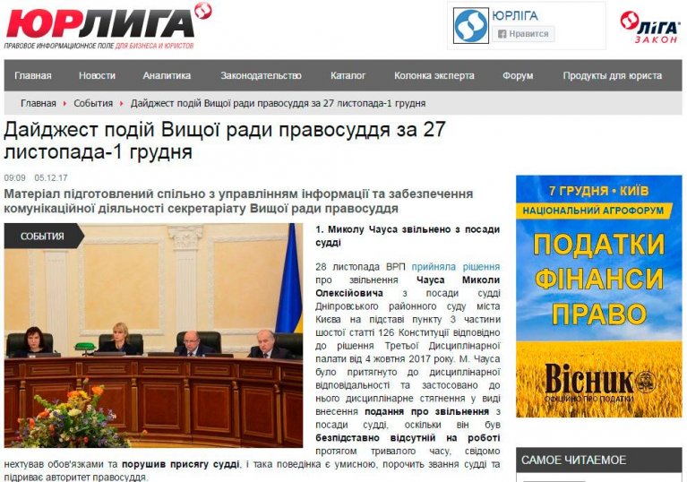 28 листопада ВРП прийняла рішення про звільнення Чауса Миколи Олексійовича з посади судді Дніпровського районного суду міста Києва на підставі пункту 3 частини шостої статті 126 Конституції відповідно до рішення Третьої Дисциплінарної палати від 4 жовтня 2017 року. М. Чауса було притягнуто до дисциплінарної відповідальності та застосовано до нього дисциплінарне стягнення у виді внесення подання про звільнення з посади судді, оскільки він був безпідставно відсутній на роботі протягом тривалого часу, свідомо нехтував обов'язками та порушив присягу судді, і така поведінка є умисною, порочить звання судді та підриває авторитет правосуддя.
